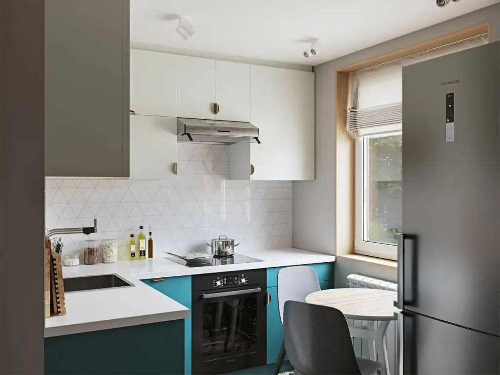 Dulapurile principale sunt decorate cu un albastru-turcoaz placut, ce invioreaza ambientul. Locul de luat masa a fost amenajat la fereastra. O parte din electrocasnice sunt incorporate, inclusiv masina de spalat rufe.