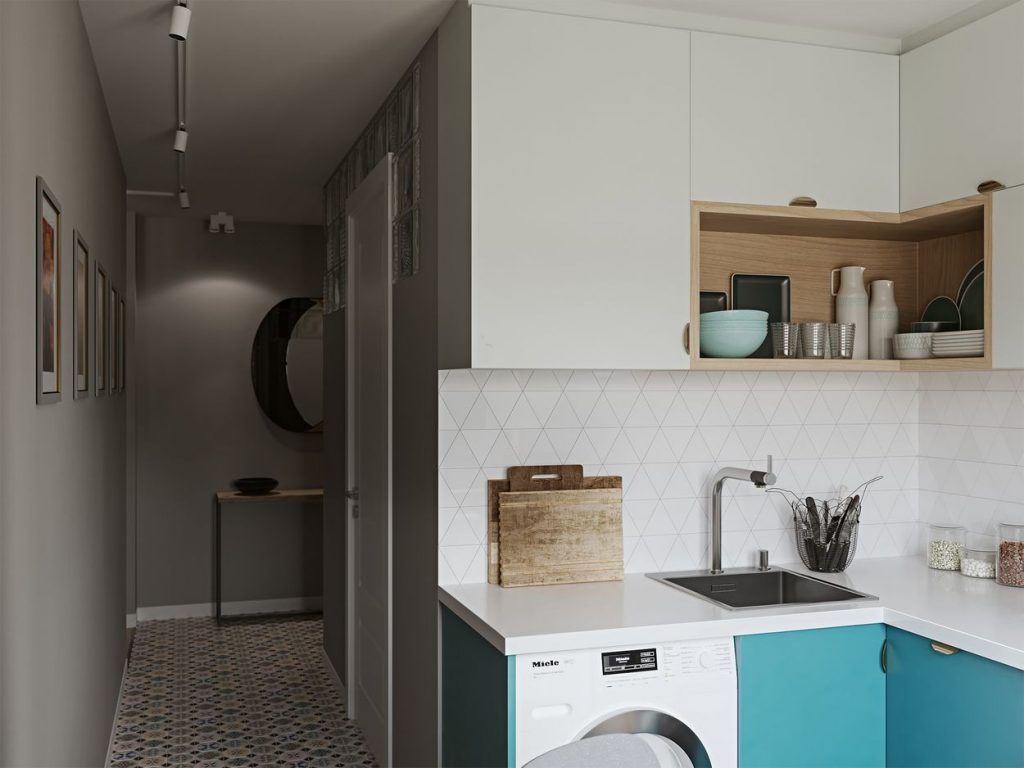 Dulapurile principale sunt decorate cu un albastru-turcoaz placut, ce invioreaza ambientul. Locul de luat masa a fost amenajat la fereastra. O parte din electrocasnice sunt incorporate, inclusiv masina de spalat rufe.