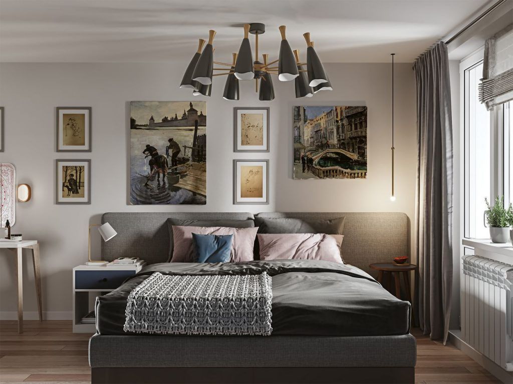 Pentru a pastra dormitorul cat mai aerisit, dulapurile cu haine au fost amenajate in hol, sub forma unui dressing cu usi glisante. Astfel, in dormitor, locul principal il ocupa patul cu o confortabila tablie tapitata si noptiere diferite pentru el si ea si corpuri de iluminat aferente, unul suspendat si cealalta sub forma unei veioze.
