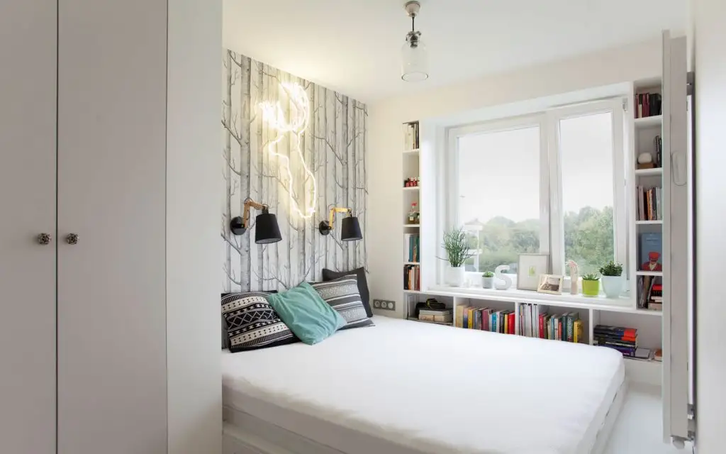 In ceea ce priveste amenajarea zonei de dormit, principala provocare a fost optimizarea spatiului de 10 metri patrati; abordarea ingenioasa a constat in conturarea unei platforme pe care a fost asezat patul, sub el fiind inserat un sertar mare pentru depozitarea pilotelor si a pernelor, lucruri care ocupa de obicei mult spatiu.