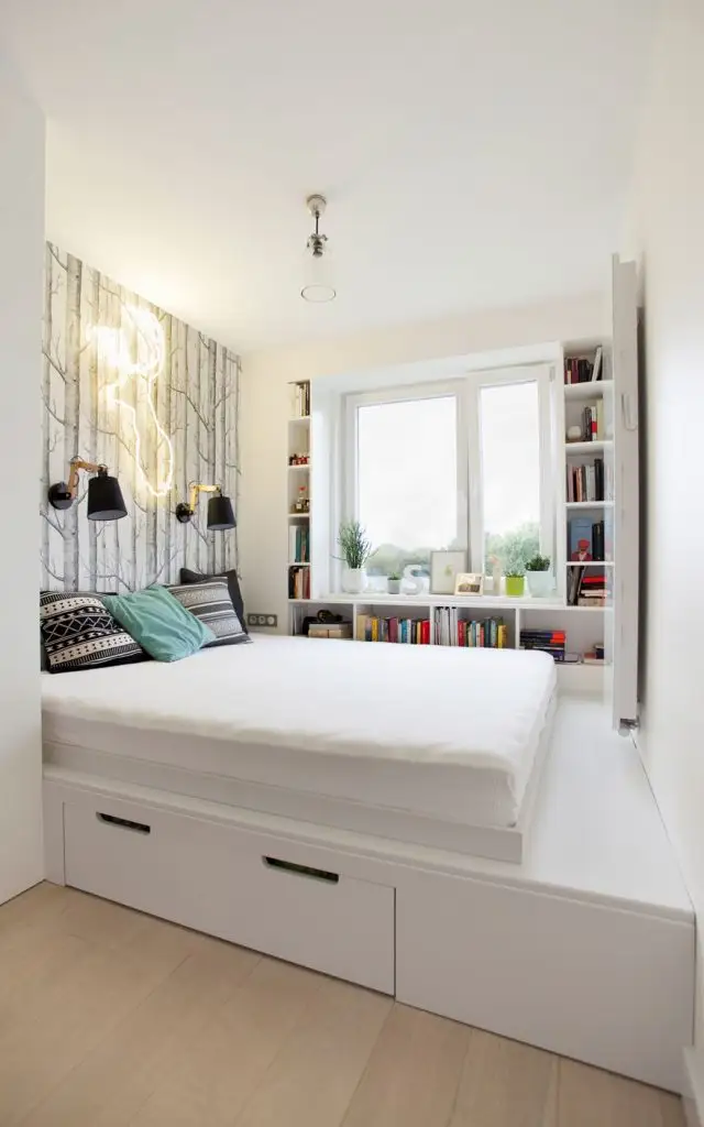 In continuarea platformei, a fost integrat un dulap destinat hainelor. Spatiul din zona ferestrei a fost si el pus in valoare printr-o amenajare simetrica a unor rafturi ce ofera un plus de spatiu pentru carti, decoratiuni si alte accesorii.