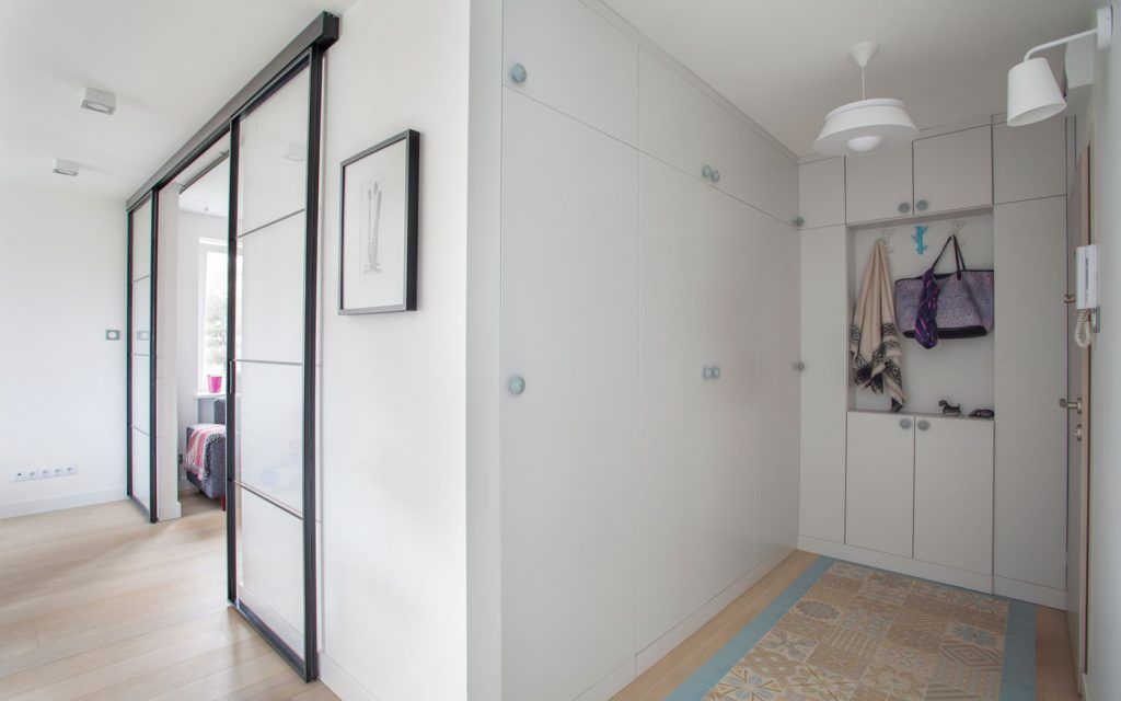 Vedere din hol spatii de depozitare incastrate intr-o nisa