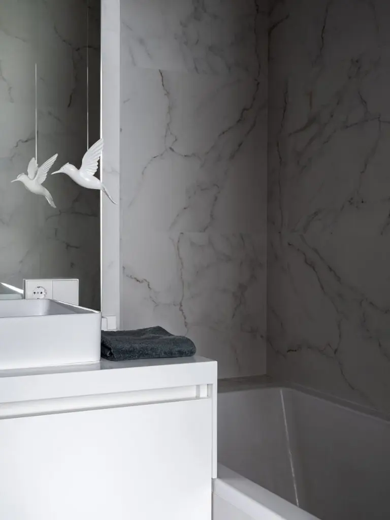 Inspirata de arhitectura pariziana, designerul a optat pentru o revizie completa a finisajelor. Astfel au aparut in cadrul amenajarii nuante calde si nobile de gri, stucaturi si profile decorative de inspiratie clasica impreuna cu tonuri de roz prafuit si accente de albastru- cobalt la nivel de mobilier si decoratiuni.