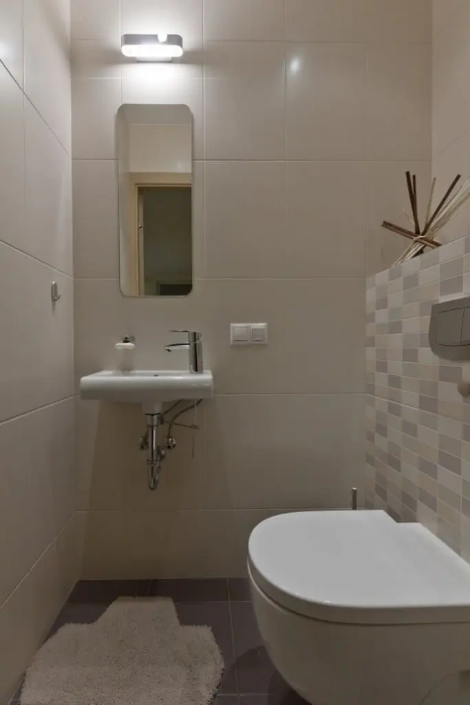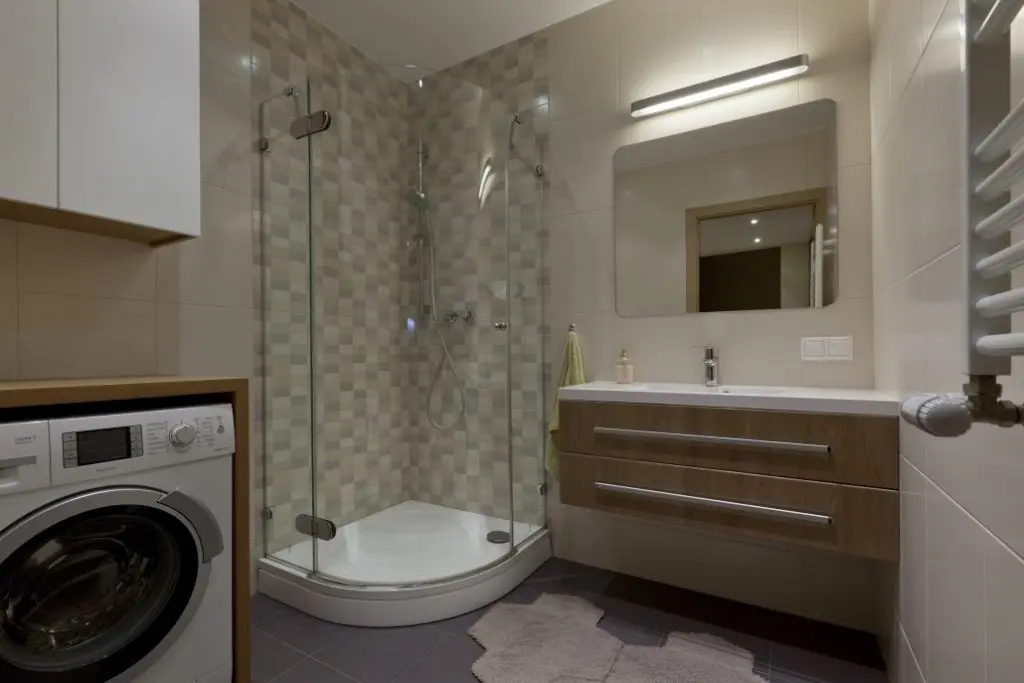 In acest apartament exista doua bai, una pentru zona de spalare si una pentru toaleta. Cea mare, include o zona de dus, ramanand astfel spatiu si pentru a integra masina de spalat rufe. Culorile neutre se potrivesc in acest spatiu. Si pentru baia de serviciu s-au folosit aceleasi placi ceramice pentru a pastra continuitatea amenajarii.