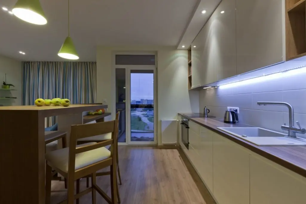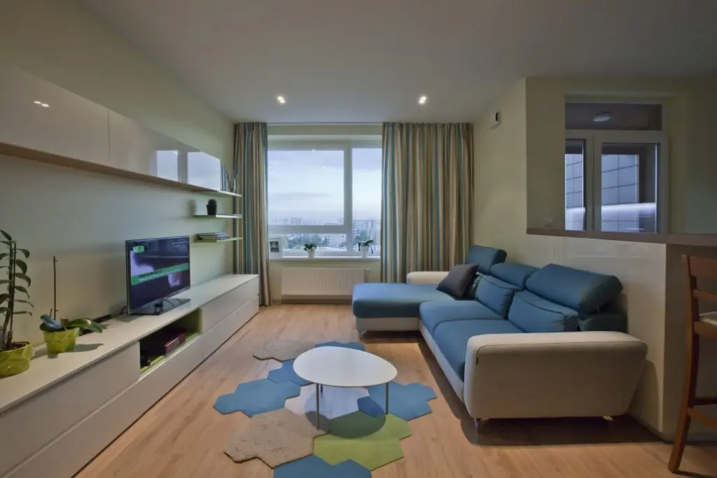 Cei doi tineri care locuiesc aici (apartamentul se afla intr-un bloc recent construit in Lituania) si-au dorit o amenajare moderna, cu bucatarie open space si o zona de zi spatioasa, in tonuri vesele si primitoare.