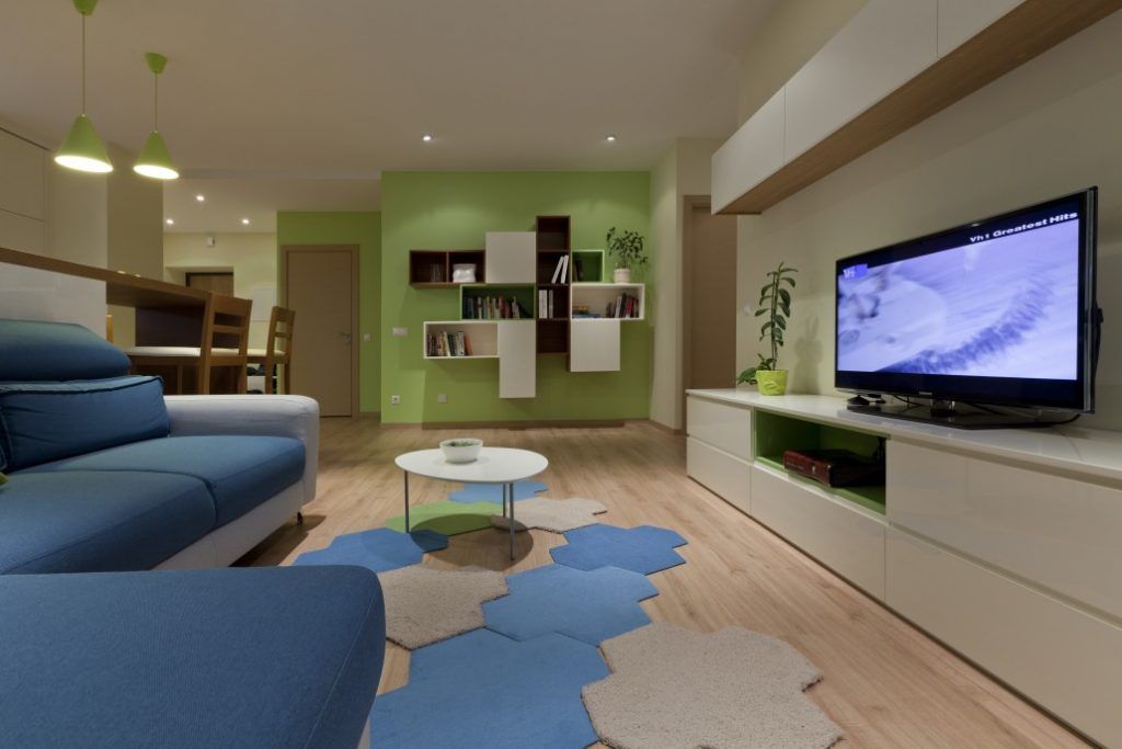 Peretele zugravit cu verde, dar si formele diferite ale rafturilor creeaza o zona de interes inamenajarea livingului.