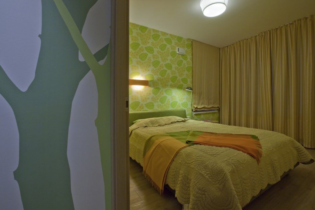 Cromatic, amenajarea urmeaza o linie bazata pe nuante neutre, de crem si bej, cu accente de verde si albastru, inserate in diferite proportii in spatiul casei. Vedem acest lucru bine evidentiat in dormitor. Aici, tonurile de verde anima amenajarea. Spatiul inspira relaxare si stare de bine. Tapetul cu imprimeu vegetal, care decoreaza peretele cu patul, iese in evidenta.