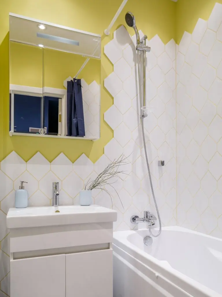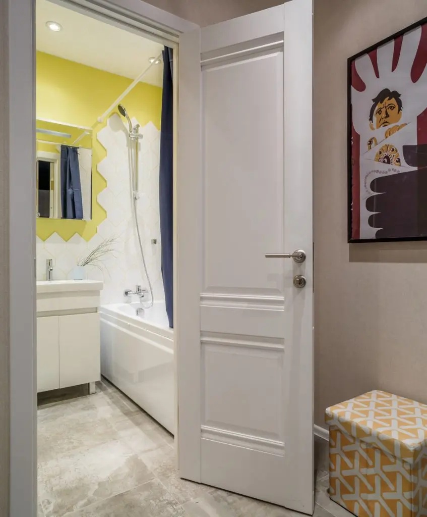 Acest apartament nu te plictiseste. Culorile intense sunt echilibrate de alb, iar tusele de rosu sau galben aduc un plus de dinamica decorului. Accente de albastru vom regasi si in dormitor, iar baia te va surprinde cu siguranta! Un joc al albului cu galben care reuseste sa imprime multa lumina si caldura spatiului. Zona de stropire din dreptul cazii si lavoarului este placata cu faianta galbena in forma hexagonala, iar restul peretilor sunt zugraviti cu galben intens, iar rosturile sunt acoperite cu chit galben. Este una din cele mai neobisnuite bai intalnite de noi!