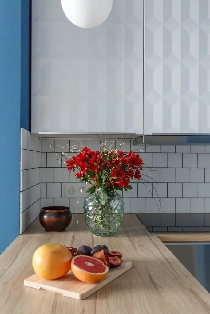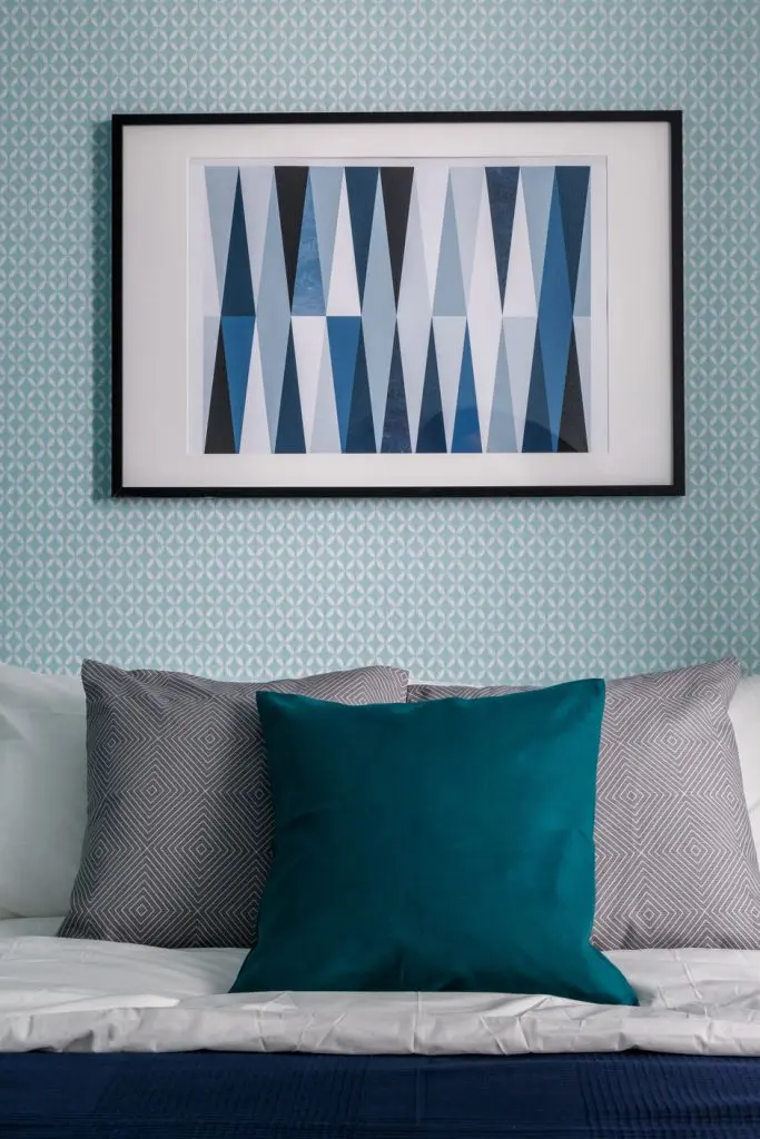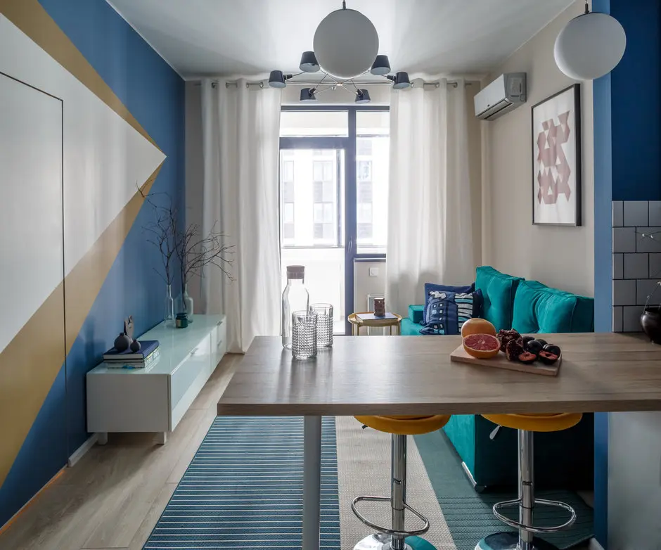 Pentru decor, cele doua designerite au mizat pe culori puternice, care sa atraga atentia si sa scoata amenajarea dintr-o zona banala. Asadar, pe un fundal cu alb si cateva nuante neutre, albastrul bucatariei, imprimeul tapetului sau turcoazul canapelei transforma spatiul intr-unul cu personalitate. Peretele opus canapelei este decorat cu un tapet geometric ce acopera si usa dormitorului. Efectul obtinut este extraordinar, iar alegerea este de-a dreptul curajoasa!