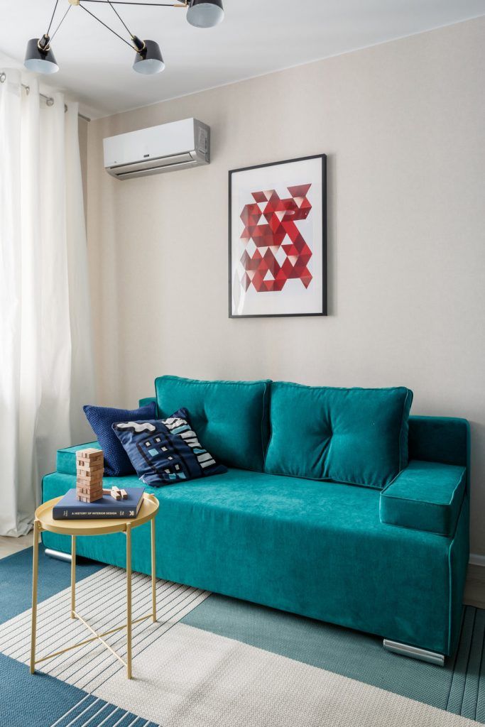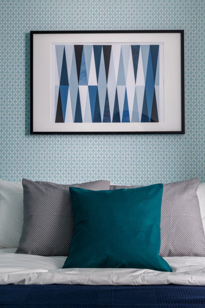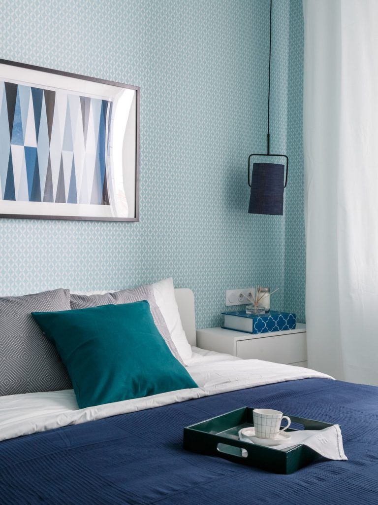 Pentru decor, cele doua designerite au mizat pe culori puternice, care sa atraga atentia si sa scoata amenajarea dintr-o zona banala. Asadar, pe un fundal cu alb si cateva nuante neutre, albastrul bucatariei, imprimeul tapetului sau turcoazul canapelei transforma spatiul intr-unul cu personalitate. Peretele opus canapelei este decorat cu un tapet geometric ce acopera si usa dormitorului. Efectul obtinut este extraordinar, iar alegerea este de-a dreptul curajoasa!