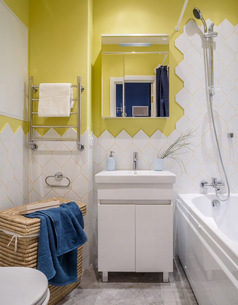 Acest apartament nu te plictiseste. Culorile intense sunt echilibrate de alb, iar tusele de rosu sau galben aduc un plus de dinamica decorului. Accente de albastru vom regasi si in dormitor, iar baia te va surprinde cu siguranta! Un joc al albului cu galben care reuseste sa imprime multa lumina si caldura spatiului. Zona de stropire din dreptul cazii si lavoarului este placata cu faianta galbena in forma hexagonala, iar restul peretilor sunt zugraviti cu galben intens, iar rosturile sunt acoperite cu chit galben. Este una din cele mai neobisnuite bai intalnite de noi!