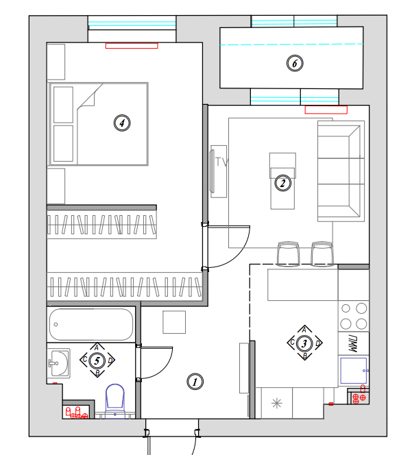Cu o suprafata de putin peste 40 de metri patrati, acest apartament mic putea fi usor transformat intr-unul tip studio, cu o singura camera ce ar fi urmat sa fie impartita in mai multe functiuni. Insa, atat Marina cat si beneficiarul s-au gandit cat de important este un loc intim, pentru odihna si, de aici, au decis ca e nevoie de inca o incapere unde sa fie amenajat dormitorul. In plus, in living, cu ajutorul unei canapele extensibile, poti gazdui peste noapte un musafir. Tot in dormitor au creat si un spatiu generos de depozitare, un dressing tip walk-in.