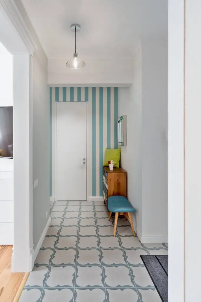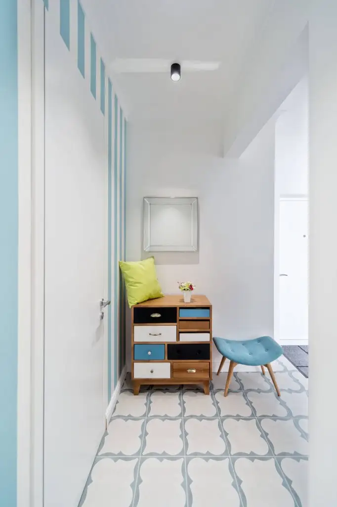Forme geometrice si discrete tonuri de albastru vom intalni si in hol. Efectul obtinut este acelasi: spatiu mai vesel si mai luminos gratie albului si al unui iluminat adecvat.