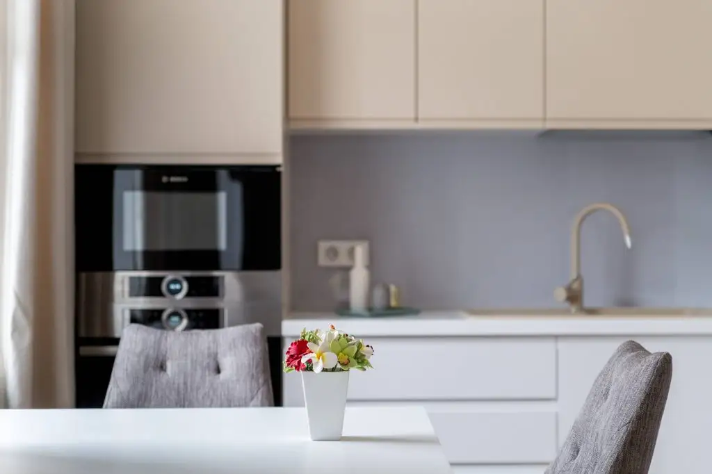 Trecerea spre bucatarie este directa, locul de luat masa delimitand discret cele doua functiuni. Masa este extensibila pentru a primi mai multi oaspeti, iar scaunele tapitate aduc o nota eleganta decorului. Amenajarea bucatariei este configurata sub forma literei L, cu electrocasnice incorporate, abordare ce imprima un caracter unitar si ordonat spatiului.