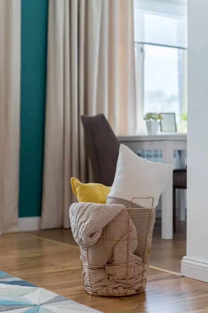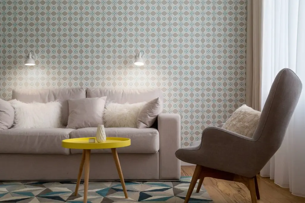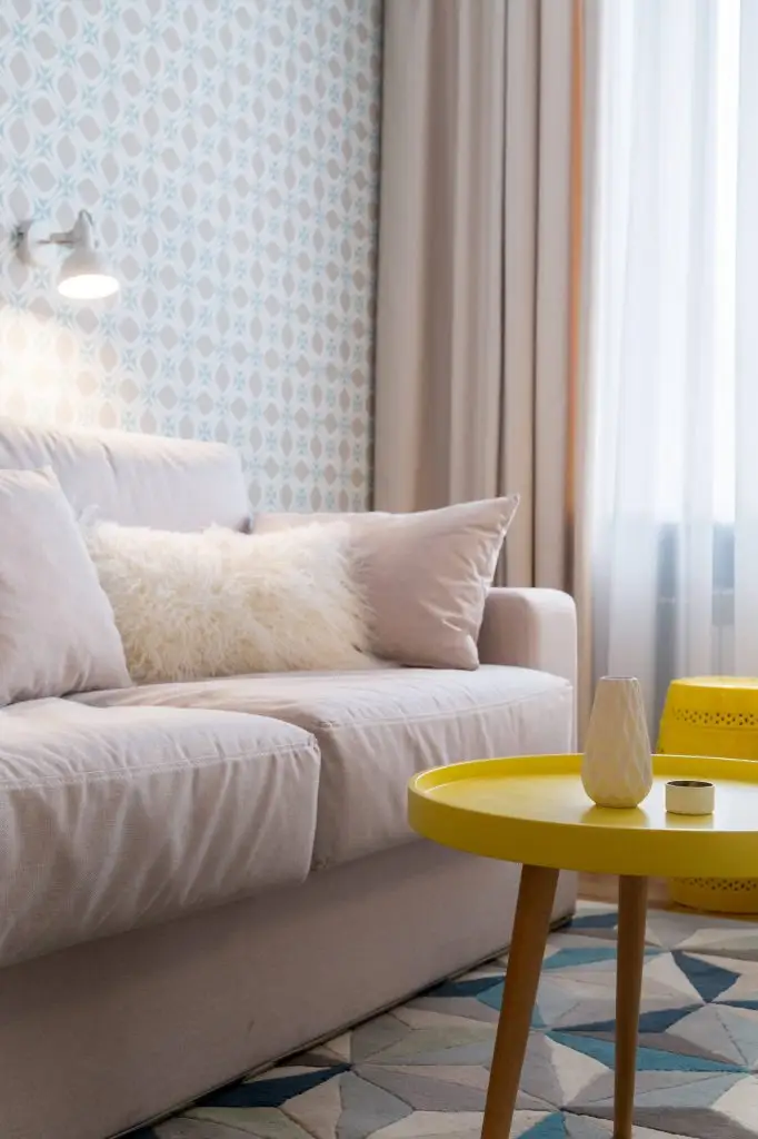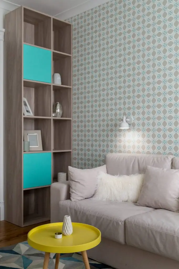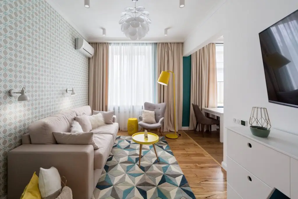 Livingul are o configuratie lunga si ingusta, de aceea pentru amenajarea lui s-a optat pentru o mobilare sumara, cu accent pe culori si texturi care sa puna in valoare decorul. Regasim tuse de galben si diferite nuante de albastru, dar si imprimeuri geometrice la nivelul covorului sau al tapetului care dinamizeaza spatiul.