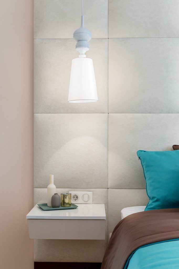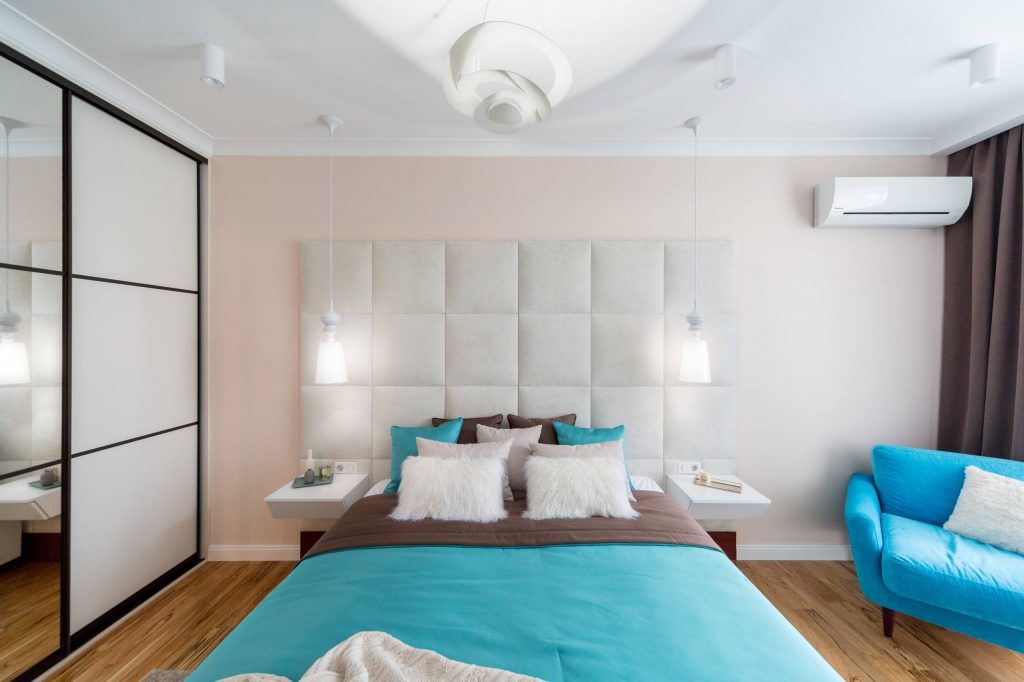 Dormitorul preia cromatica din living, albastrul fiind culoarea-accent predominanta. Patul ocupa spatiul central al camerei, iar tablia tapitata, prelungita pana in dreptul noptierelor sporeste confortul. Pentru depozitarea hainelor a fost amenajat un dressing cu usi glisante si oglinda pe una din fatetele ei.
