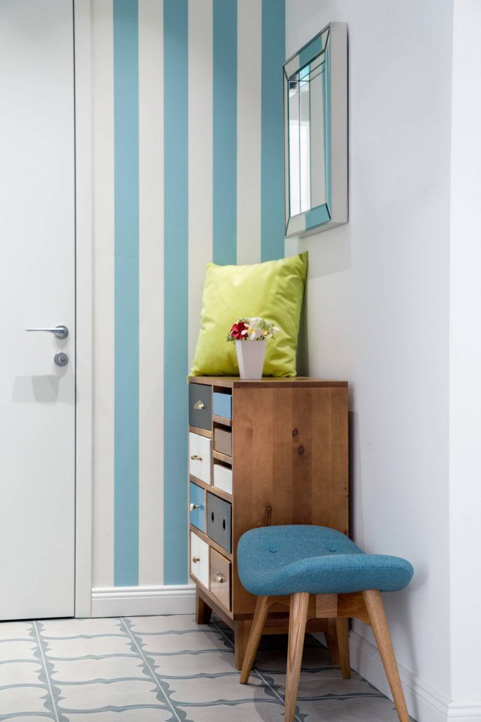 Forme geometrice si discrete tonuri de albastru vom intalni si in hol. Efectul obtinut este acelasi: spatiu mai vesel si mai luminos gratie albului si al unui iluminat adecvat.