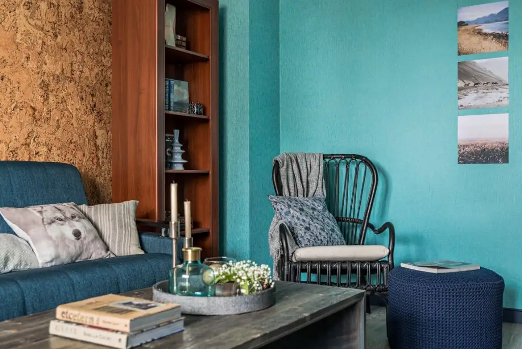 Livingul este o camera luminoasa, ceea ce a si permis introducerea multor elemente albastre. Peretii, canapeaua, fotoliul, pernele decorative, pouful sau alte mici decoratiuni expun pe deplin pasiunea beneficiarilor pentru aceasta culoare. Pentru unii din noi ar putea parea prea mult albastru, senzatia oferita fiind de o camera rece.