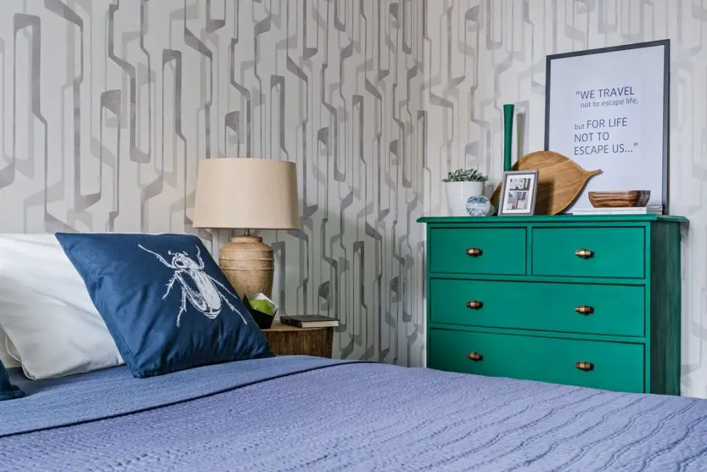 Cromatic si stilistic, dormitorul pare a fi cea mai echilibrata camera. Culorile tari sunt estompate. Le putem regasi doar ca accent la nivelul accesoriilor sau mobilierului. Modelul de tapet ales ofera o baza excelenta pentru ca albastrul si verdele sa iasa in evidenta intr-un mod placut.
