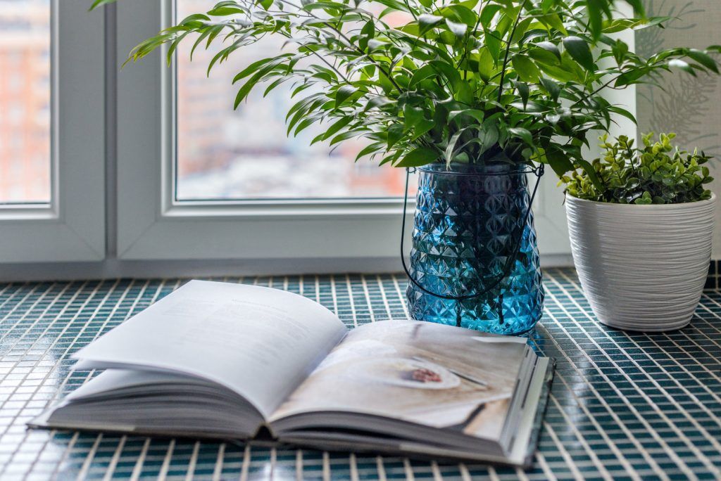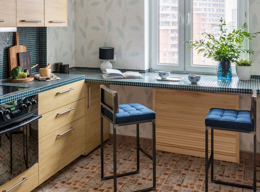 Ne place modul cum spatiul din jurul ferestrei a fost valorificat: un blat extins, pe lungimea peretelui, placat cu un mozaic albastru asigura o zona de luat masa, baut cafeaua de dimineata, citit sau admirat privelistea. In plus, spatiul creat este binevenit atunci cand se gateste. Acelasi tip de mozaic a fost ales si pentru braul dintre corpurile de mobilier.