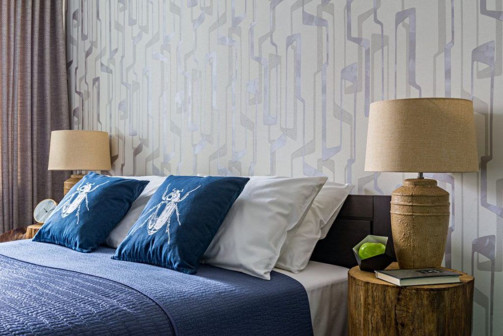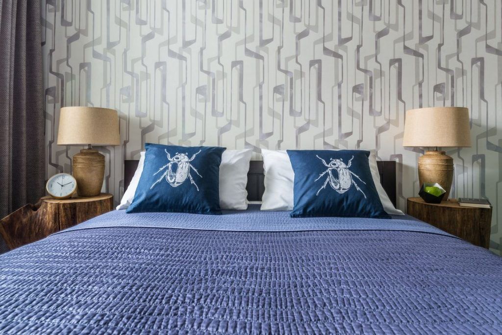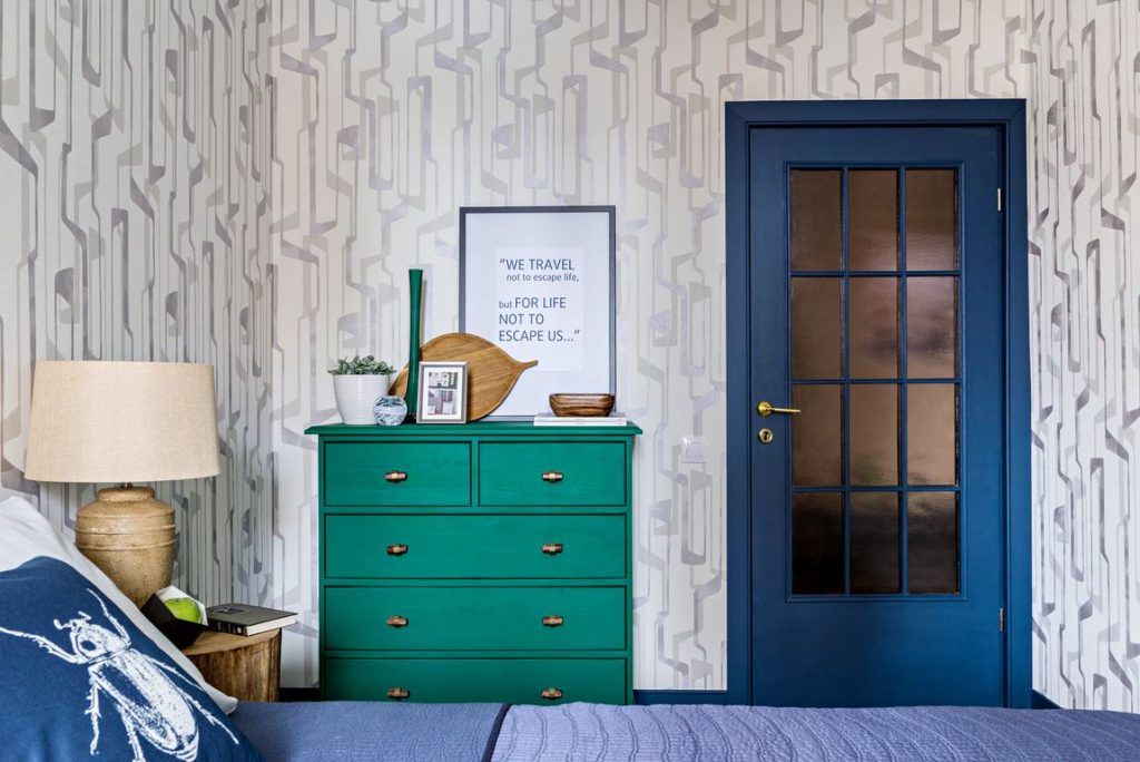 Cromatic si stilistic, dormitorul pare a fi cea mai echilibrata camera. Culorile tari sunt estompate. Le putem regasi doar ca accent la nivelul accesoriilor sau mobilierului. Modelul de tapet ales ofera o baza excelenta pentru ca albastrul si verdele sa iasa in evidenta intr-un mod placut.
