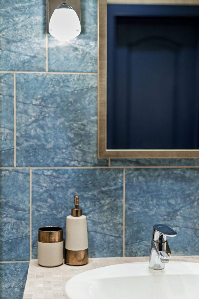 Si bucataria preia tematica albastrului intr-o proportie mai redusa, de aceea, aceasta incapere pare mai primitoare. Ajuta mult esentele de lemn ale mobilierului, dar si tapetul cu model discret ce anima usor ambientul.