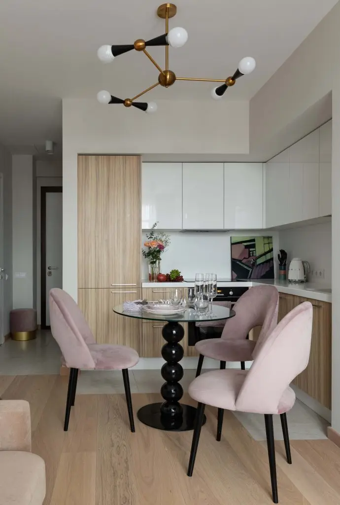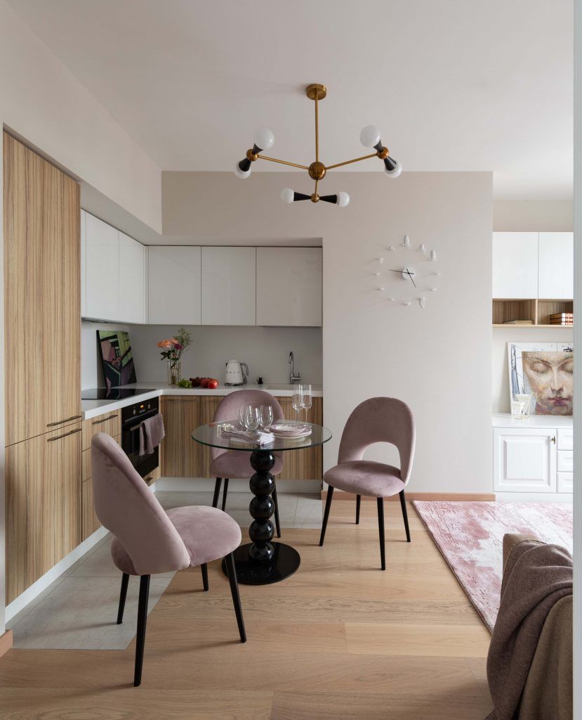 Bucataria mica, moderna, este practica si in acelasi timp contribuie la confortul si eleganta spatiului. Blatul acesteia, plinta si corpurile suspendate, realizate din mdf alb lucios, contrasteaza armonios cu restul fetelor de usi, din furnir de lemn. Masa rotunda de sticla aplifica spatiul, fiind o prezenta transparenta si sculpturala in cadrul amenajarii.