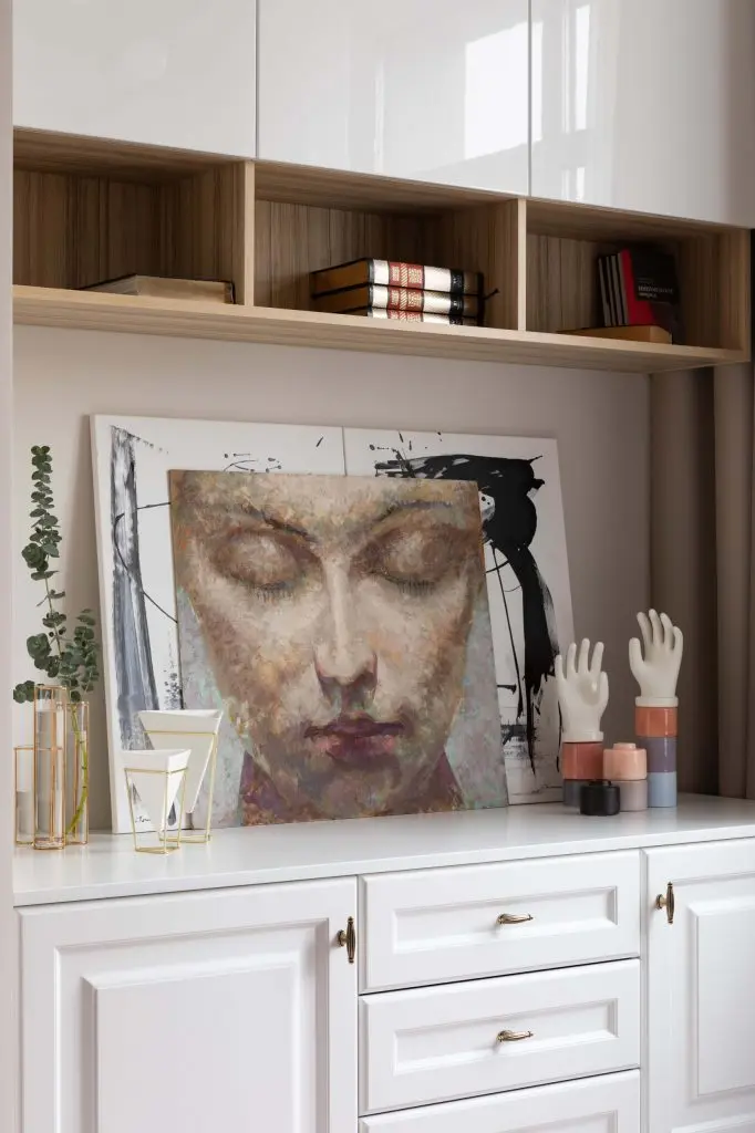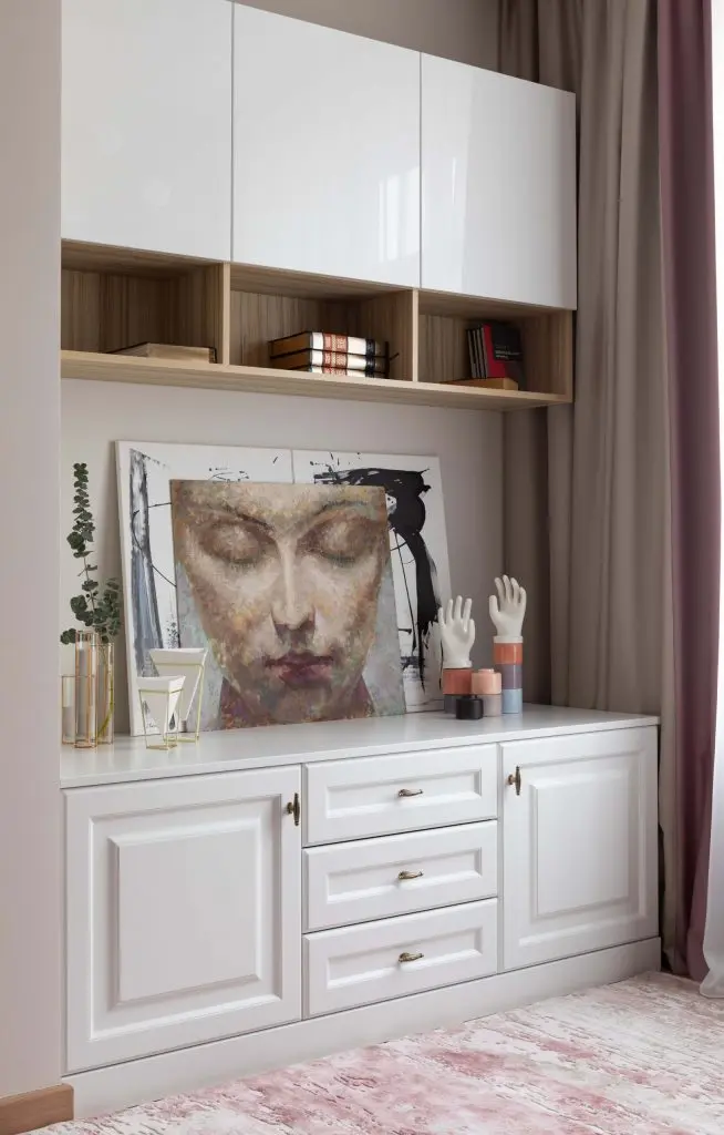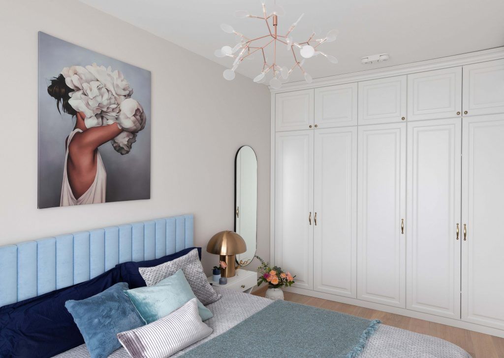 Dulapurile incastrate, cu inaltimea pana in plafon creeaza iluzia unei camere inalte si asigura spatiul de depozitare necesar. Usile albe prezinta profilaturi inspirate din mobilierul clasic si contribuie astfel la eleganta generala a amenajarii.