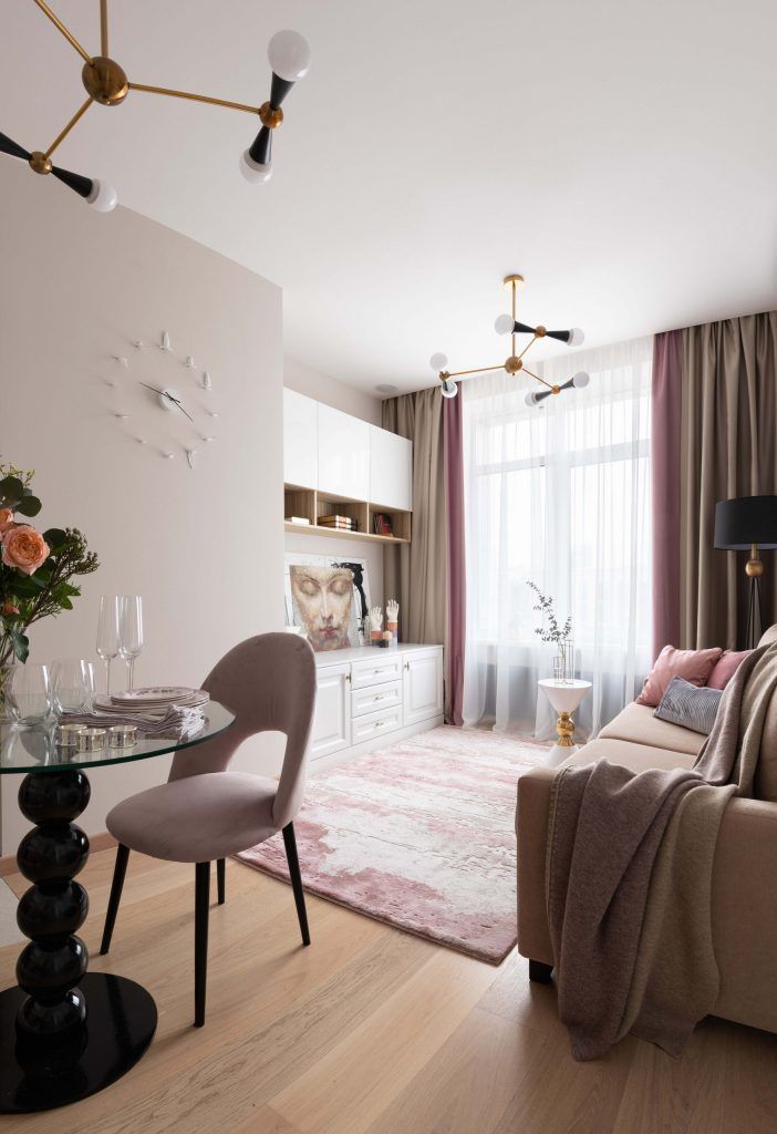 Zona de zi a fost conceputa ca un open space compus din living, o bucatarie mica dispusa in forma de “L” si loc de luat masa, comunicand direct cu holul de intrare. Spre deosebire de dormitor, zona de zi a fost amenajata integral in nuante calde, pastelate, evocand un univers feminin, plin de gratie si rafinament.