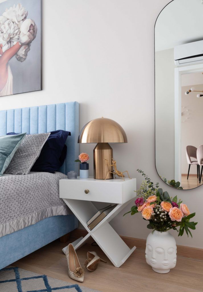 Tablia patului, riflata, din catifea bleu, a fost incadrata armonios de doua veioze mari, sculpturale, amplasate pe noptiere cu spatii de depozitare extem de practice. Compozitia de perne decorative sintetizeaza paleta cromatica utilizata in amenajarea dormitorului, avand texturi diferite, care confera o nota de dinamism spatiului.