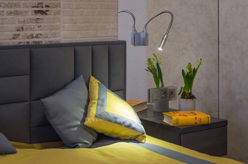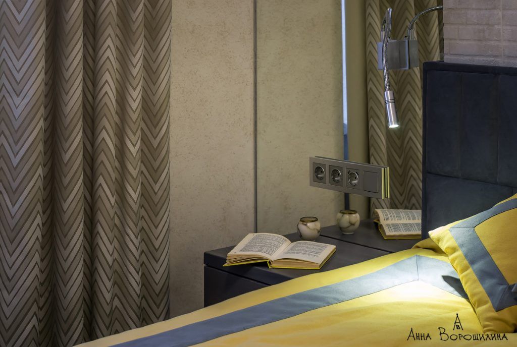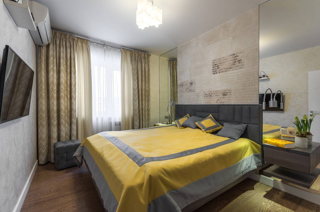 Pentru dormitor, s-a mizat pe nuante mai blande, neutre, mai odihnitoare. Galbenul este prezent discret la nivelul cuverturii si al pernelor decorative. Dorind sa creeze impresia de spatialitate, designerul a mizat pe o idee pe cat de simpla, pe atat de eficienta: montarea a doua oglinzi dispuse simetric de o parte si cealalta a patului. Pe mijloc a fost integrata o zona ce imita caramizile, iar tablia tapitata a patului aduce un plus de confort.