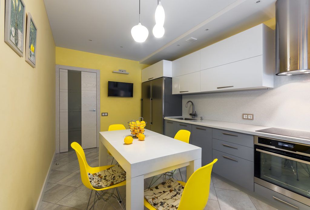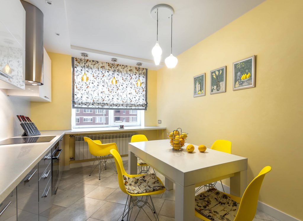 Si pentru bucatarie s-a mizat pe aceeasi linie minimala, dar cu accent pe functionalitate si, bineinteles, pe galben. Mobilierul este dispus liniar, cu spatiile de depozitare necesare; in plus, blatul de lucru se continua si de-a lungul ferestrei avand astfel mai mult spatiu pentru gatit sau luat o gustare sau pur si simplu pentru accesorii si decoratiuni. In centrul incaperii, a fost amenajat locul de luat masa cu o masa extensibila alba si scaune tip Eames galbene. Draperia in stil roman atrage privirea prin imprimeul sau vesel.