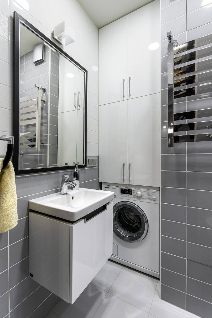 Functional a fost amenajat si spatiul din baie, astfel incat sa poata fi integrata masina de spalat rufe si depozitare sub forma a doua dulapuri suprapuse. Fiecare spatiu din acest apartament este o sursa de inspiratie si speram sa-ti fie de folos pentru propria renovare!