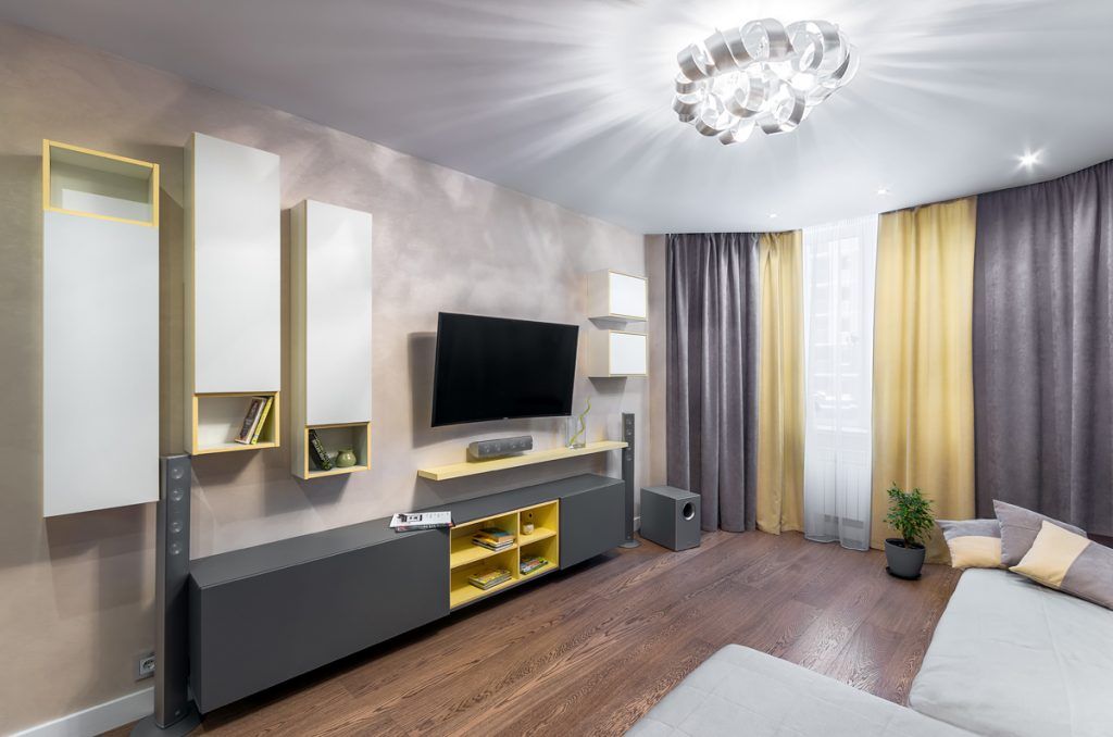La nivelul livingului amenajarea a fost gandita cat mai aerisit posibil, cu o mobilare axata pe piesele principale. Un set de trei corpuri asimetrice suspendate, altele doua mai mici si un corp tip comoda la baza televizorului si o canapea tip coltar compun pe scurt decorul din living. Cu ajutorul textilelor si al combinatiei de galben cu gri spatiul primeste personalitate alaturi de un iluminat scenografic care aduce un plus de stil amenajarii.