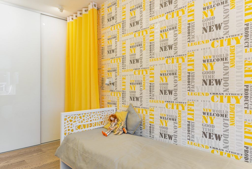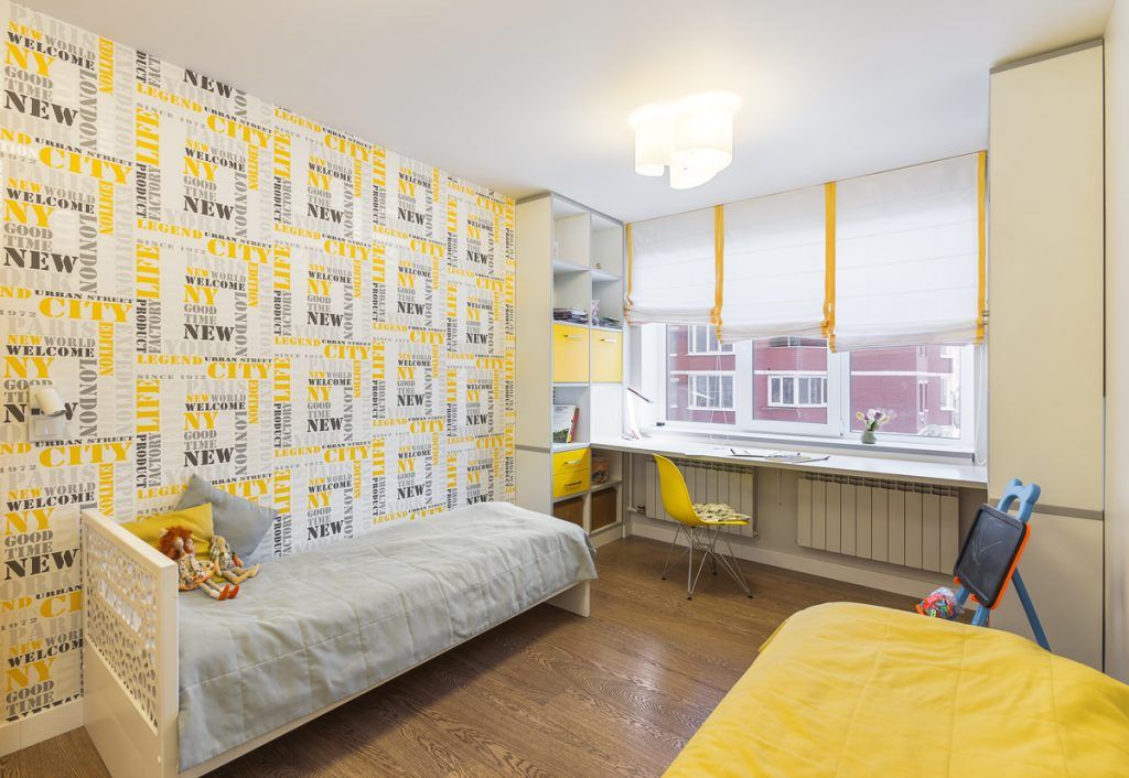 Camera copiilor ne introduce intr-o lume vesela si colorata, in care galbenul joaca rolul principal. Decorul este echilibrat cu alb, crem si bej, iar lumina naturala face ca spatiul sa para mai mare, mai aerisit. Tapetul cu imprimeu viu colorat creeaza un perete-accent ce atrage atentia de la intrarea in camera. La fereastra a fost gandit spatiul pentru birou, sub forma unui blat lung, cu depozitare pe ambele laturi.