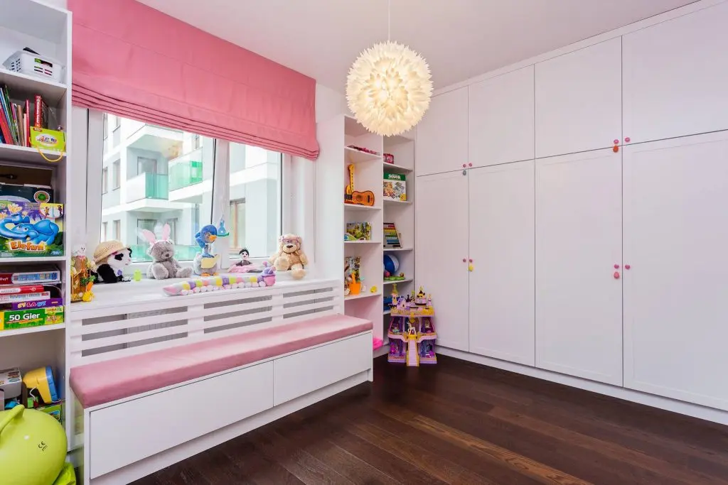 In dormitorul fetelor se remarca locul de citit si relaxare de la fereastra care continua o masca de calorifer inteligent amplasata.