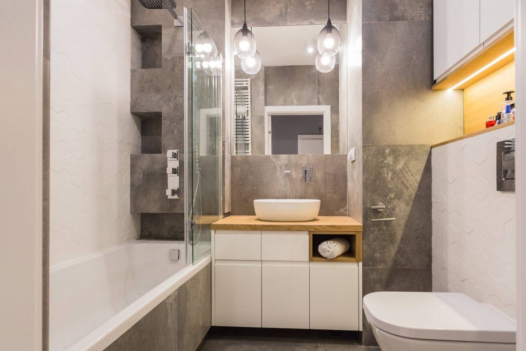 Baia in stilul industrial modern reuseste sa aiba suficiente spatii de depozitare in ciuda spatiului evident redus.