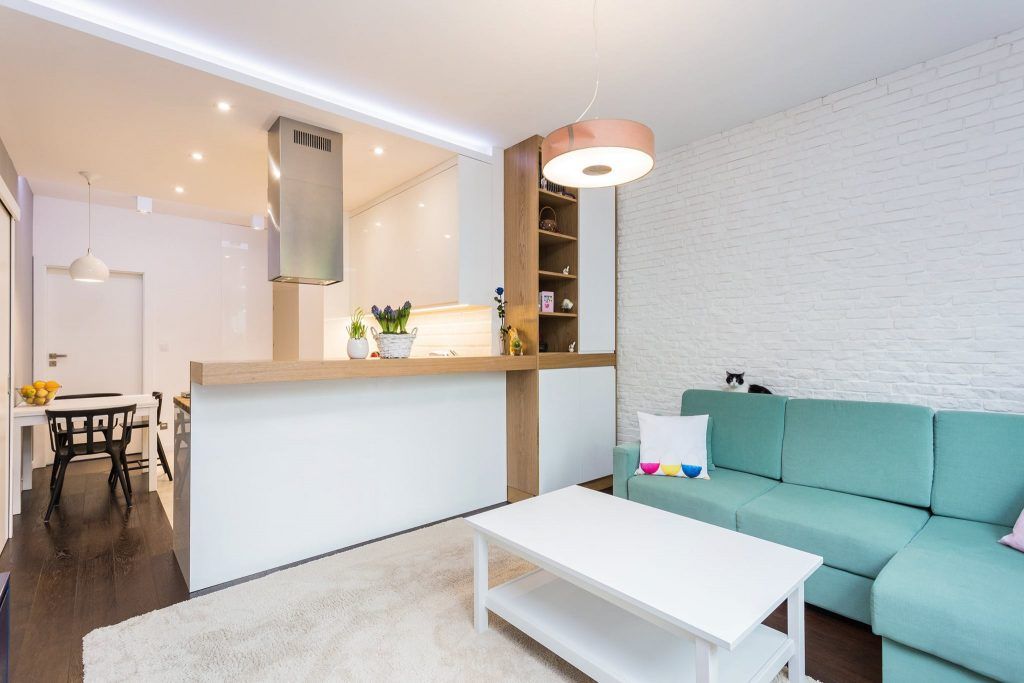 Atat bucataria, cat si livingul sunt amenajate intr-un stil minimalist nordic in care predomina albul care contrasteaza cu cateva obiecte in culori pastel.
