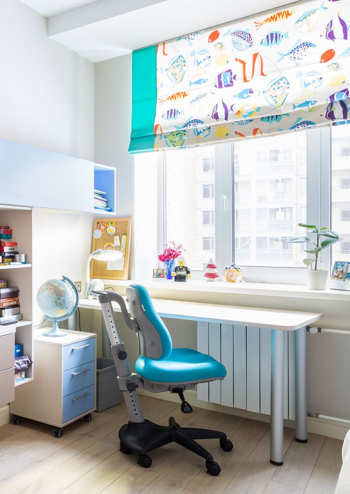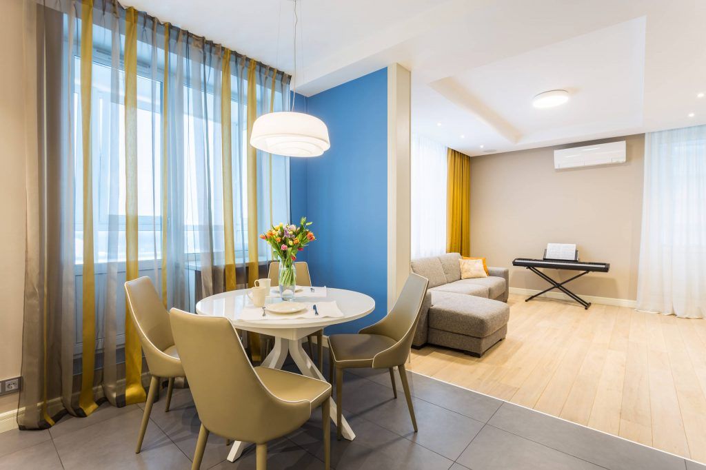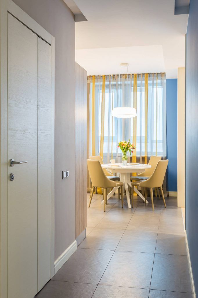Predomina nuante neutre de crem si bej, dar si accente de culoare precum albastrul sau galbenul care inveselesc atmosfera si imprima un aer dinamic.