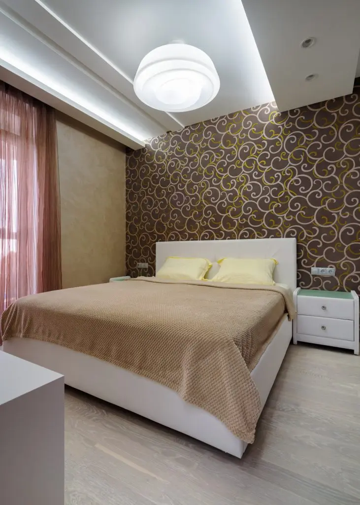 Unul din dormitoare se acceseaza direct din living, iar celalalt din holul ce poate fi zarit in imagini. Ca zona de accent, pentru ambele incaperi s-a folosit un tapet cu imprimeu puternic, acelasi tip de depozitare si aceleasi lustre. Parchetul din lemn intr-o nuanta foarte deschisa asigura continuitatea intre spatii, in ciuda gresiei din bucatarie si hol.