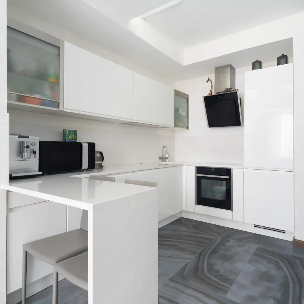 Pentru bucatarie, a fost ales un mobilier alb, lucios pentru a reflecta lumina si a spori efectul de spatialitate. Electrocasnicele sunt incorporate, iar braul dintre corpuri a fost placat cu panou din sticla transparenta pentru a obtine acelasi efect mentionat mai sus. Separarea de living se face printr-un corp tip bar ce poate fi folosit ca atare, ca blat de lucru suplimentar sau ca o zona de birou.