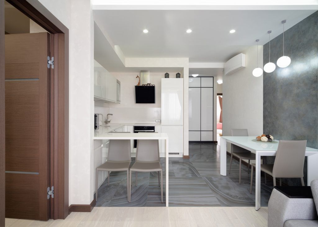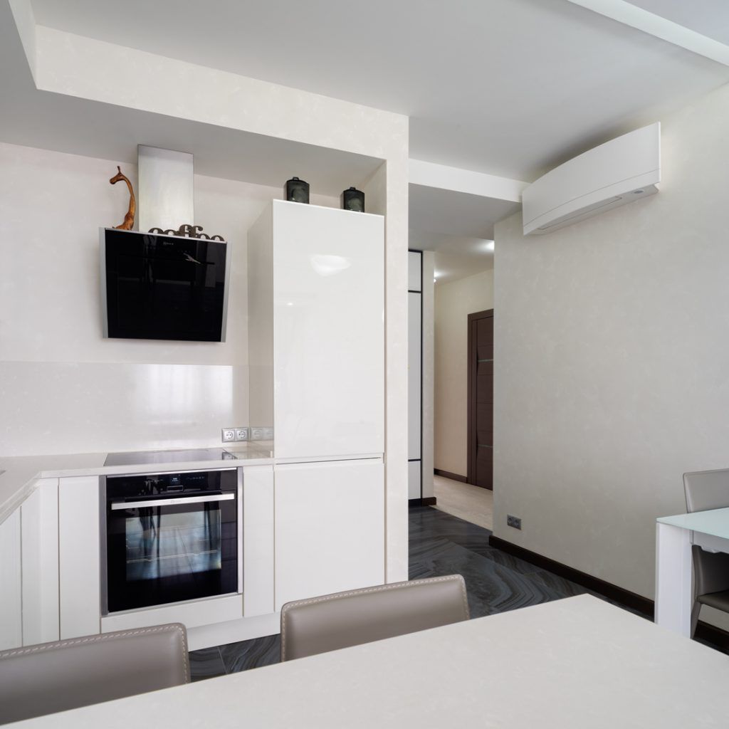 Pentru bucatarie, a fost ales un mobilier alb, lucios pentru a reflecta lumina si a spori efectul de spatialitate. Electrocasnicele sunt incorporate, iar braul dintre corpuri a fost placat cu panou din sticla transparenta pentru a obtine acelasi efect mentionat mai sus. Separarea de living se face printr-un corp tip bar ce poate fi folosit ca atare, ca blat de lucru suplimentar sau ca o zona de birou.