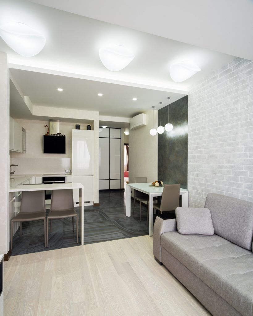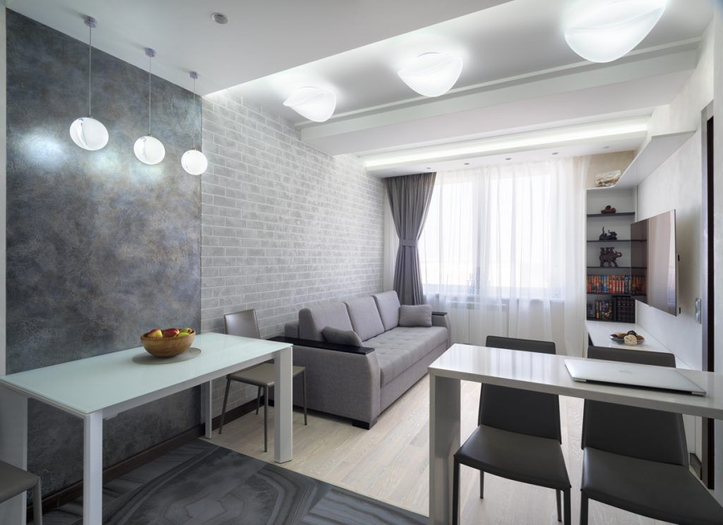 In living, canapeaua si zona T V alaturi de un corp mic de biblioteca reprezinta singurele piese care au fost alese pentru a reda aceasta functiune. Pentru un plus de textura, peretele cu canapeaua a fost placat cu placi ceramice albe ce imita caramida, iar corpurile de iluminat, spoturile si benzile L ED contribuie la crearea de diferite scenarii.