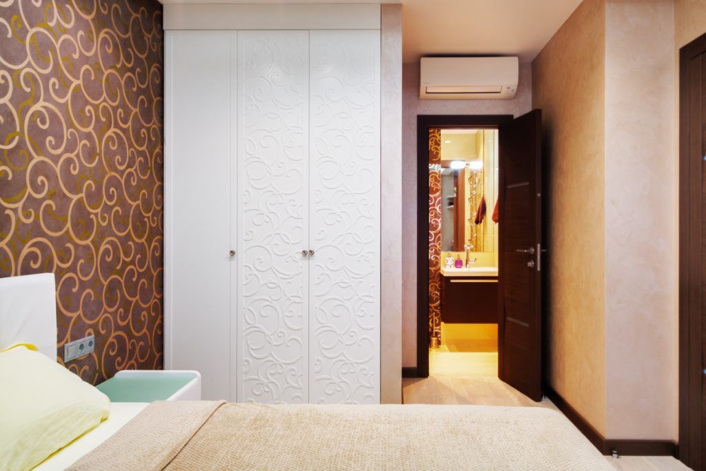 Unul din dormitoare se acceseaza direct din living, iar celalalt din holul ce poate fi zarit in imagini. Ca zona de accent, pentru ambele incaperi s-a folosit un tapet cu imprimeu puternic, acelasi tip de depozitare si aceleasi lustre. Parchetul din lemn intr-o nuanta foarte deschisa asigura continuitatea intre spatii, in ciuda gresiei din bucatarie si hol.
