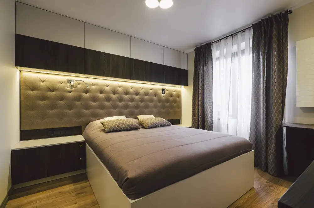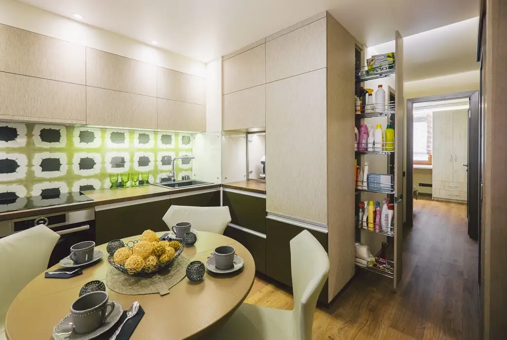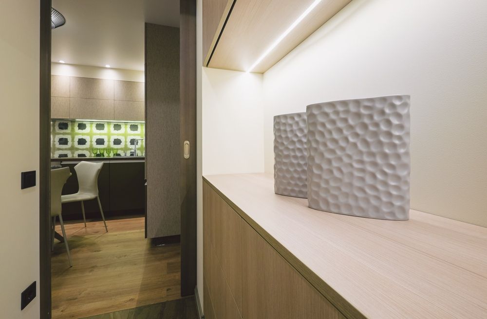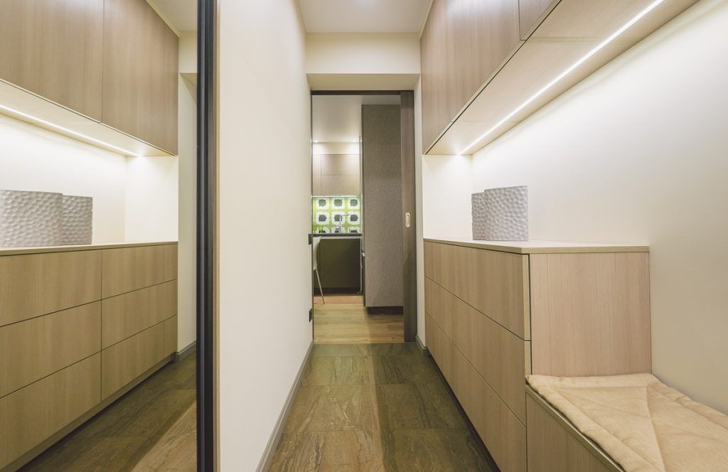 Benzile LED sunt integrate atat la nivelul bucatariei, cat si al dormitorului sau chiar pe holul de la intrare, unde spatiile de depozitare se regasesc sub forma unor corpuri principale, cat si a unor dulapuri suspendate in partea superioara.