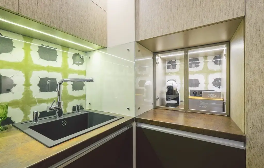 Pentru zona bucatariei, amenajarea isi pastreaza caracterul functional. Mobilierul compact, dispus in forma literei L ofera spatii de depozitare, iar electrocasnicele incorporate mentin un caracter unitar. Frontul dintre corpurile de mobilier este acoperit cu acelasi tip de tapet din spatiul livingului, dar acoperit cu panouri din sticla transparenta pentru a-l proteja de pete si stropi.