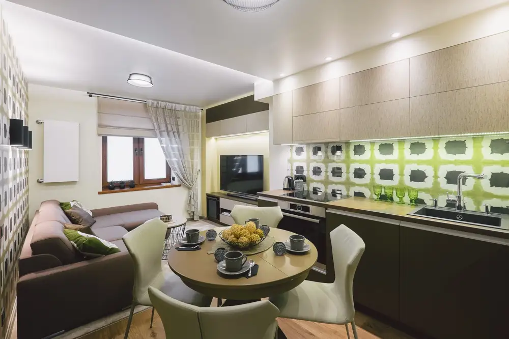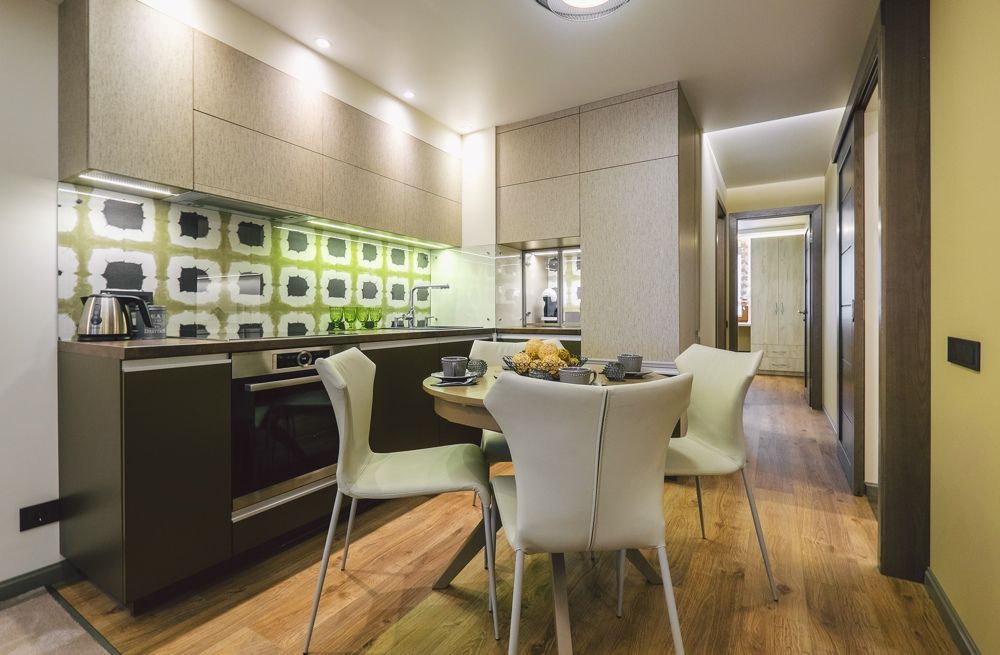 Spatiul zonei de zi din acest apartament este destul de restrans. Cu toate acestea, cele 2 functiuni se inlantuiesc armonios si sunt bine puse in valoare.