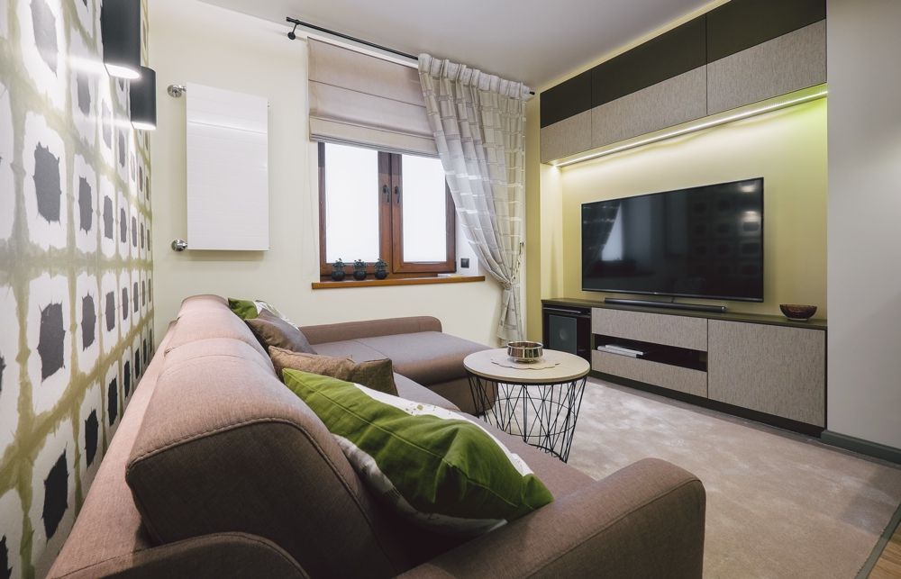 Pentru partea de living decorul este tratat minimal, cu piesele strict necesare: canapea, corpuri cu dulapuri suspendate si consola pentru televizor; canapeaua coltar inlocuieste cu succes nevoia unui fotoliu, iar covorul uneste vizual toate aceste elemente. Tapetul cu imprimeu vesel contureaza un perete-accent ce distrage atentia de la dimensiunile spatiului.