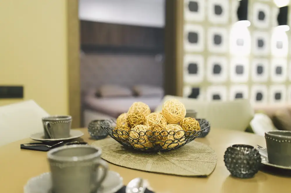 Culorile folosite imprima caldura si veselie spatiului. In ciuda dimensiunilor reduse, albul nu este folosit excesiv. Predomina nuante de crem, ivoire sau bej, cu accente de galben-verzui si verde. Esentele naturale de lemn completeaza in mod fericit decorul.
