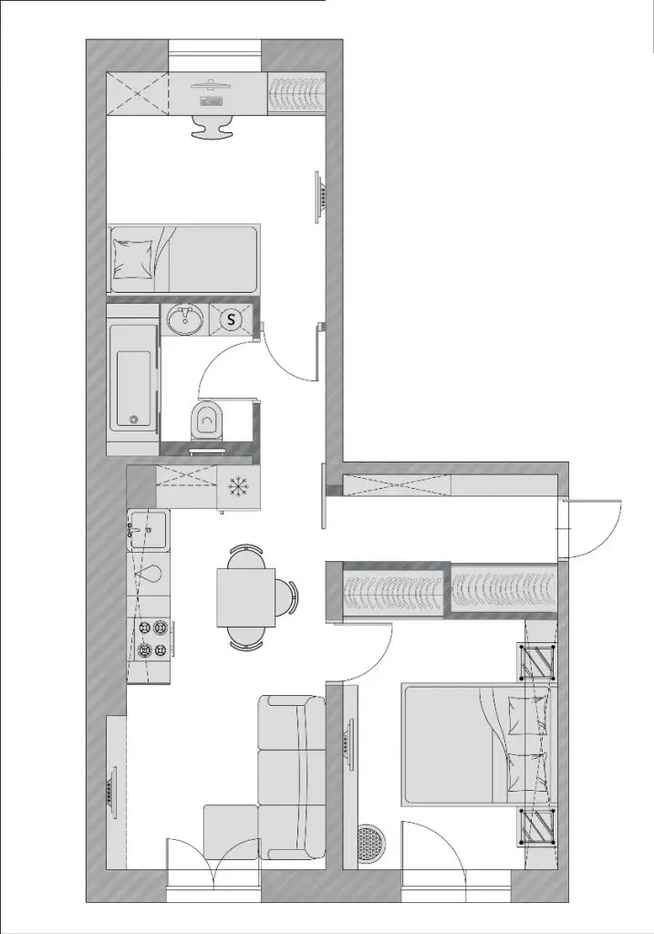 Deschide GaleriaUnul din compromisurile pe care ar trebui sa le faci intr-o astfel de situatie ar fi renuntarea la bucatarie ca o incapere de sine statatoare. In cazul de fata, bucataria este una tip open space, in plan deschis cu livingul. Celelalte 2 incaperi au fost amenajate ca dormitoare.
